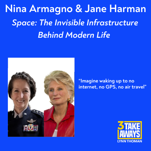 Space may look empty, but it’s crowded, fragile, and under threat. Former Congresswoman Jane Harman and Lieutenant General (Ret.) Nina Armagno — former U.S. Space Force Director of Staff who oversaw missile warning, satellite operations, and space launches — reveal how satellites quietly keep the world running, and how quickly it could all go dark.